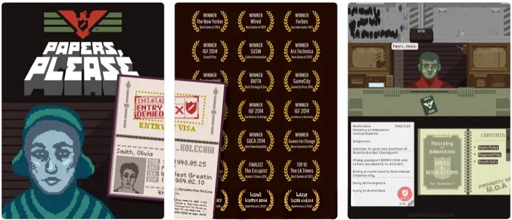 Papers, Please (《请出示证件》)是3909工作室开发的一款像素风模拟类游戏。游戏背景发生在80年代一个虚构的独裁国家阿什托兹卡,玩家将扮演该国家的边境检察员,每天的工作任务是检查入境人员的证件,并批准或拒绝入境。